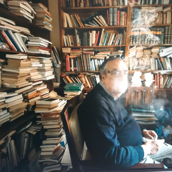 El tipo de la imagen se llama Julio Manuel de la Rosa. Es escritor y profesor. Nació en Sevilla. La fotografía la he tomado en la exposición que sobre escritores andaluces hay en la planta baja de la biblioteca pública de Jaén, junto a la sección infantil, donde me sumerjo con un zagal de siete años casi todas las tardes de los viernes. Disfrutamos ambos. Nos divertimos entre tantos libros. Pero quien ha de ser feliz, tremendamente feliz, es Julio Manuel. Y yo le/lo envidio. La imagen me asombra. Esa imagen demuestra que el cerebro humano es muy, muy plástico -y elástico-. Y que la literatura no se enseña, ni se aprende: se descubre. Pídele a Dios que te descubra a «Literatura».