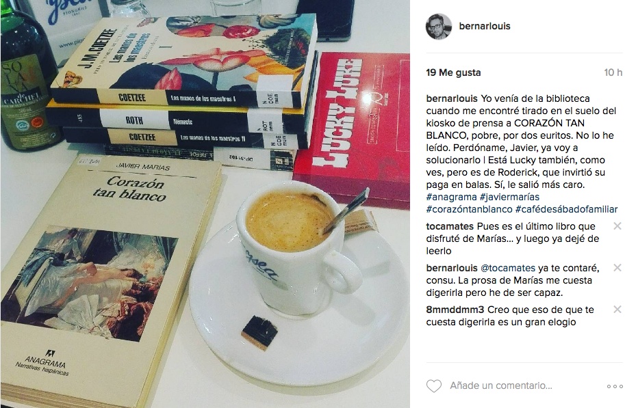 Y hoy quiero acabar esta entrada insertando una fotografía. La que tomé ayer por la mañana en una cafetería de Jaén. La historia es que tuvimos que visitar la biblioteca porque R tenía libros en rojo, es decir, con plazo vencido. Además el viernes olvidé sacar El año de la peste, de Defoe. Quería con él grabar un vídeo junto al otro libro que refiere otra peste,  Némesis. Puedes suscribirte al canal YouTube para no perderte ningún vídeo. Ayer aproveché y saqué el libro de Coetzee que fue el origen de que leyese a Defoe y a Némesis. El tomo I, que leí y el dos que no lo leí. A ver si multiplicando alguna hora del día resulta su lectura, que va a ser difícil. Y bien, ¿para qué escribo todo esto? Para contar que apareció ante mí Javier Marías. R quería el último cómic de Lucky Luke y decidió invertir su paga en él. Fuimos al kiosko y cuál fue mi sorpresa al divisar, tirado en el suelo, enfrente del kiosko de prensa, a Corazón tan blanco en una edición de Anagrama (hoy habla Alberto Olmos de él). Y es que había estado escuchando y leyendo estos días a Marías, que si su reedición de Corazón tan blanco, que si gracias a él pudo empezar a vivir de la literatura y que allí estaba para mí. Y lo compré por dos euros. Los libros, quedó demostrado, acuden a ti cuando piensas en ellos. Quería contar esta singular mañana que pasé ayer con L y R, mis hijos. Lo demás no os interesa. Pero era sábado, imaginad.