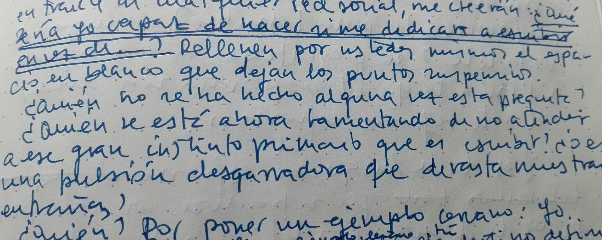 ¿Quién no se ha formulado alguna vez esta pregunta? ¿Quién se ha lamentado o se está lamentando por no haber atendido a ese instinto primario que es la escritura? ¿Quién y cómo se sacia esa pulsión que desgarra y devasta yo no sé qué desgarra y qué devasta? ¿Qué sucede si la ignoras? ¿Quién se la ha formulado alguna vez con sinceridad y consecuencias?