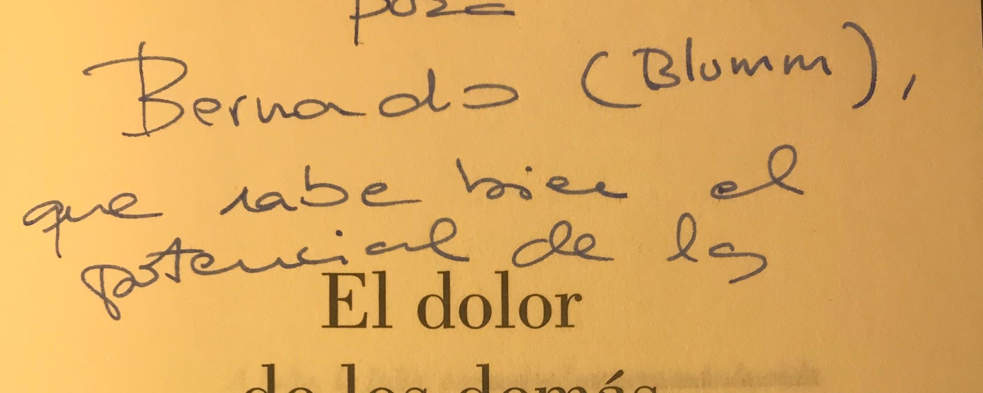Qué alegría por fin. He de reconocer que lo primero que he hecho cuando le he visto ha sido abrazarle. Su libro me ha ayudado muchísimo. Al final de la charla, mientras me lo firmaba, le he revelado algo, algo muy íntimo. Mi vida tiene alguna que otra línea paralela y se lo he dicho. Descubrir paralelas en los libros de los demás provoca emoción y evita que ese libro pase a ser un libro más. Con El dolor de los demás ha sucedido. Su lectura ha supuesto una terapia. La lectura, a fin de cuentas, es una conversación entre tú y los personajes, entre tú y el autor, entre tú y tú, al final. Para eso sirve leer, leer solo sirve para eso, para encontrarte, para situarte en el mundo, para enaborlar la bandera de la libertad interior, que es la que única que vale y la única con la que te sientes bien.