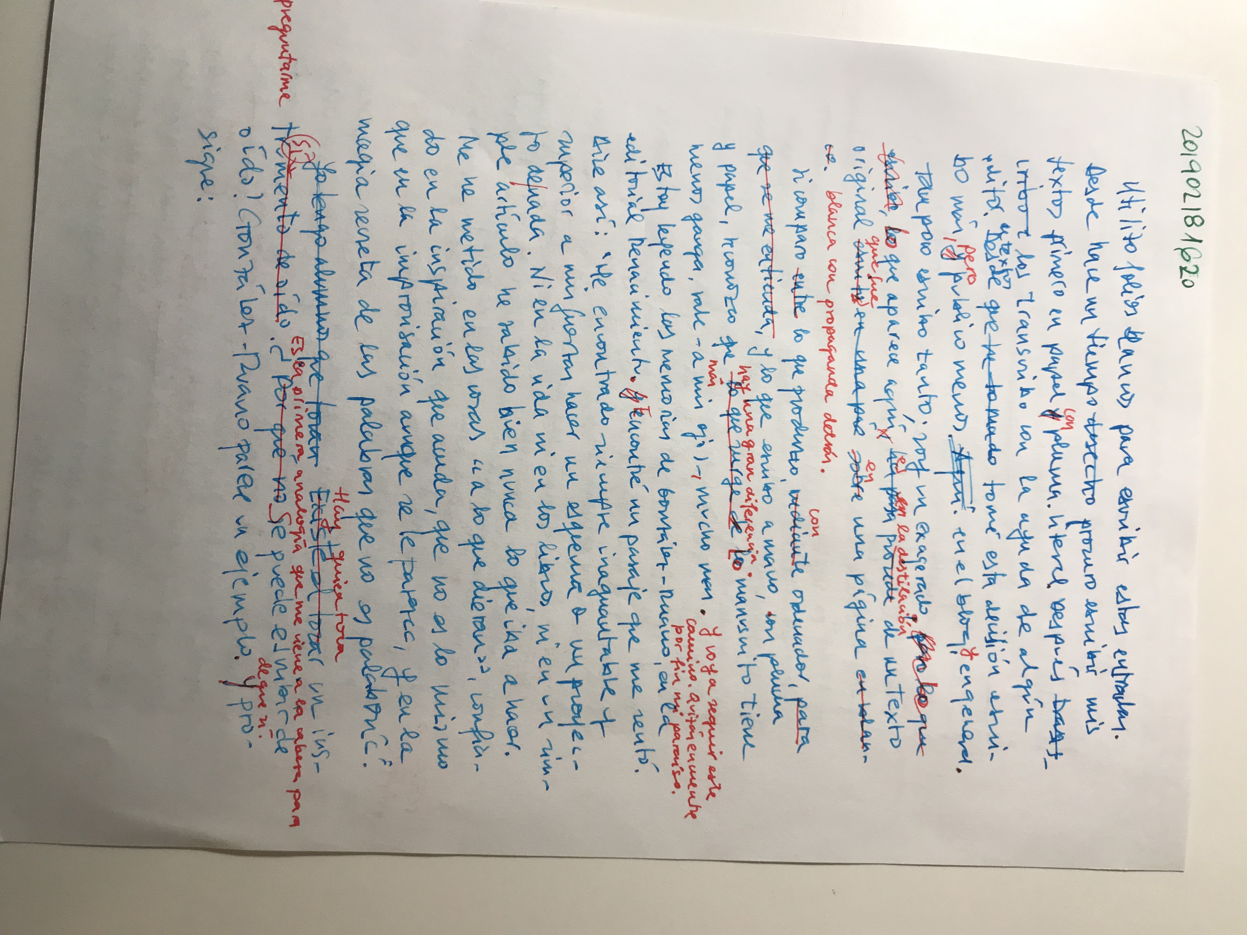 Me fulmina, sí, me fulmina de esta manera tan rotunda cuando hace desaparecer del horizonte de su quehacer lo que a mí me paraliza cuando escribo con el ordenador: al censor, al corrector de estilo que alimento cuando escribo así. Esta es una de las causas por las que quiero persistir en esta forma de nueva escritura, más lenta, pausada, manuscrita. Por eso adoro escribir con máquina de escribir y no con ordenador.