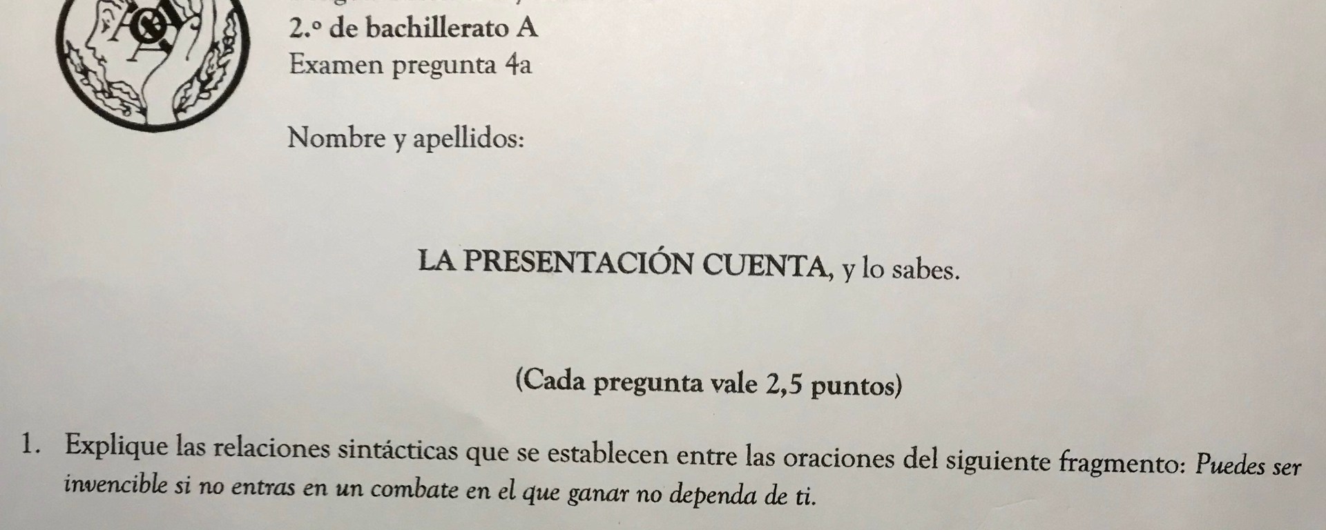 El brócoli es bociógeno, pero con aceite de oliva, sal y pan integral, constituye una cena sana, aunque hay que comer de todo de manera equilibrada. Puede que ahora te hayas planteado la duda de si el último “aunque” que he utilizado es adversativo o concesivo, pero mira, te voy a dar un truco rápido. Si el “aunque” lo puedes sustituir por “pero” es adversativo y si puedes sustituirlo por “a pesar de que” es concesivo. Por tanto, ahora, después de corregir sesenta exámenes de sintaxis puedo afirmar que han surgido nuevas especies de oraciones, por ejemplo, las coordinadas adverbiales, o las subordinadas copulativas, o esas chulas chulas denominadas subordinadas disyuntivas y que la sangre me borbote de no sé dónde cuando vuelva a ver, por enésima vez suelo decir, un verbo atributivo y ¡su complemente directo! Pero yo lo que digo es que, si a la gente le cambias un perro por un gato se da cuenta, ¿verdad? ¿Por qué a un número elevado de alumnos le cambias el “soy” o el “es” por un fue o parecer y no reconocen un atributo y sí un complemento directo? Yo no sé si soy bueno o malo explicando, la verdad. A mí lo que me gusta mucho es lo que hago, y para hacer que a alumnos que no han hecho un examen en su vida de sintaxis les haya gustado el pasatiempo de presentarme 50 oraciones -algunos me confiesan que se llevaban las frases al baño-, no está nada mal, a pesar de que -concesivo- la sintaxis en sus vidas les sirva para, para, venga, atrévete a introducir una subordinada adverbial de finalidad, bueno, miento, una construcción final, según la NGLE. Lo que sí sé, lo que tengo clarísimo para el año que viene si imparto en 2.º de bachillerato -me encantaría- es que la sintaxis la explicaré con toda la terminología nueva, la moderna, la que inauguraron hace diez años. Mientras tanto, y gracias a Dios, ya tengo seleccionados los dos textos del examen final, que será un simulacro de Selectividad: uno de Ricardo F. Colmenero; el otro de don Pío, que me fascina.