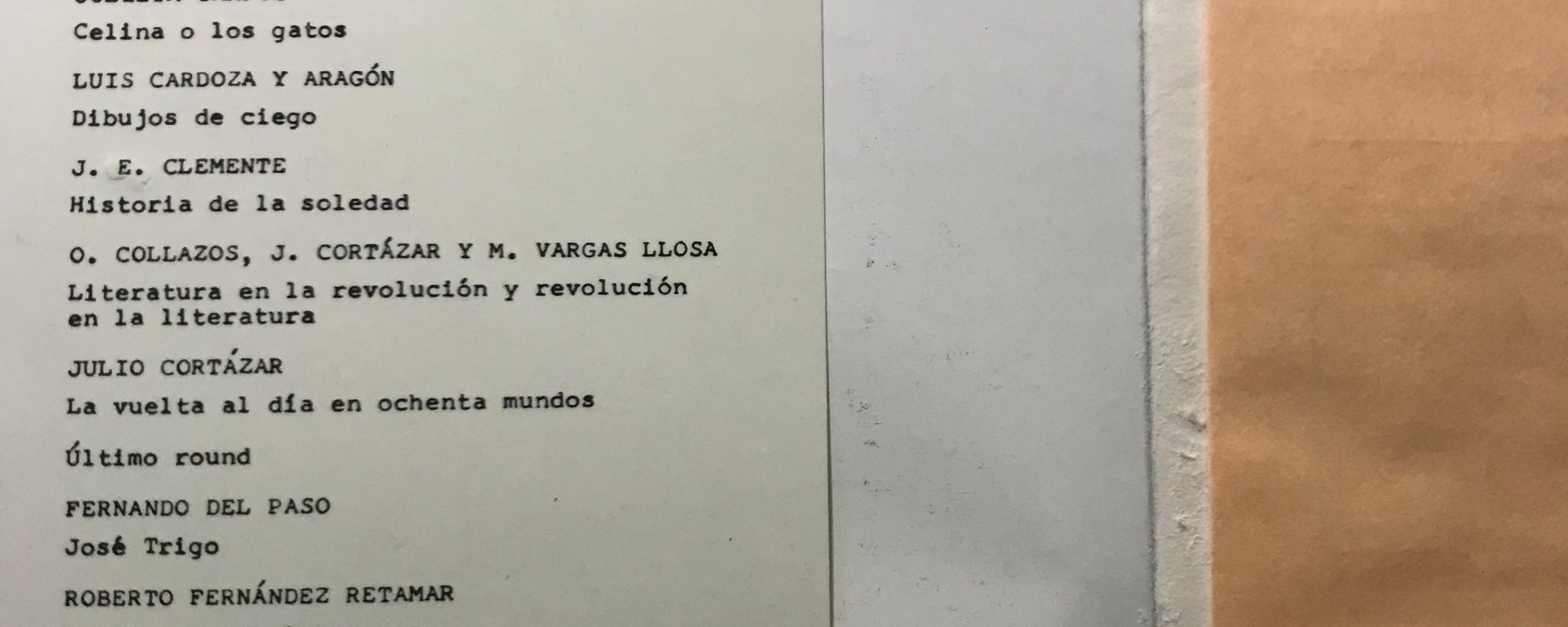Esta tarde me entretuve en conocer quién era Enrique Anderson Imbert. Después, he comenzado la lectura del expurgado. Y he empezado por las solapas, donde he encontrado a autores que sí conocía y a autores que no. Este ejercicio ha sido, en realidad, un test de vigencia, un test que me ha vuelto a demostrar que los escritores deberían abandonar la escritura si su fin es escribir un libro-hamburguesa, como he escrito esta tarde en Twitter. Los libros que no perduran están escritos por autores que ya hemos olvidado y que no han conseguido entrar en ningún canon, ni en el de los olvidados. Acabo. Sírvanse: Los días contados, de Fernando Alegría; Ajedrez. Navegaciones, de Homero Aridjis; El espejo de Lida Sal, de Miguel Ángel Asturias; Poesía joven de México, de A. Aura, L. Ayala, J. C. Becerra y R. Garduño; La muerte y otras sorpresas, de Mario Benedetti; Nueva antología personal, de Jorge Luis Borges, El escritor y su obra, de J. L. Borges y G. Charbonnier; Celina o los gatos, de Julieta Campos; Dibujos de ciego, de Luis Cardoza y Aragón; Historia de la soledad, de J. E. Clemente; Literatura en la revolución y revolución en la literatura, de O. Collazos, J. Cortázar y M. Vargas Llosa; La vuelta al día en ochenta mundos y Último round, de Julio Cortázar; José Trigo, de Fernando del Paso; A quien pueda interesar, de Roberto Fernández Retamar; Muros de luz, de Marco Antonio Flores; Zona sagrada y Todos los gatos son pardos, de Carlos Fuentes; La aparición de lo invisible y El libro, de Juan García Ponce; El aprendiz de brujo, de Sergio Mondragón; Las llaves de Urgell, de Carlos Montemayor; Aquí, allá, en esos lugares y Luz que se duerme, de Raúl Navarrete; Corriente alterna, de Octavio Paz; Anagnórisis, de Tomás Segovia; Los hombres a caballo, de David Viñas; Fricciones, de Saúl Yurkiévich; La máquina de cantar, de Gabriel Zaid y La tumba de Antígona, de María Zambrano.