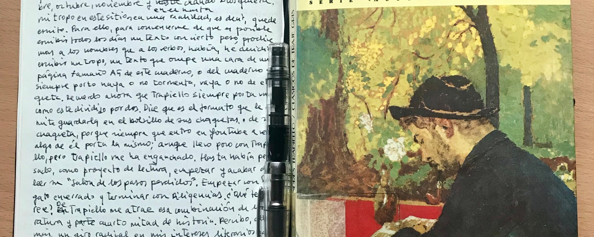 Se acerca agosto y después, sin lógica ni costumbre, septiembre. Mes donde los engranajes de la rutina laboral empezarán a chirriar hasta que el aceite llegue a todos los ejes. Hoy escribo este tropo en primera persona porque he de pensar, idear y maquinar la manera, estrategia y truco para mantener la escritura de mis tropos diarios durante septiembre, octubre y noviembre; y después. He de convencerme de que es posible escribir todos los días y publicar todos los días y transcribir todos los días lo que escribo en el cuaderno o en un folio o en un papel, porque ya no escribo directamente en el ordenador; empieza a darme grima escribir así. La misma grima que le tengo a Facebook, pero ahora no es el protagonista. Escribir un texto con más nombres que verbos es el fin, quizás el objetivo de quien quiere escribir algo más extenso algún día, o nunca. Ya saben, soy del clan “Preferiría no hacerlo”; primera persona. Y había decidido escribir, para ir acostumbrando el tempo, no más de una página del cuaderno que porto allí donde hago descansar a mi sombra. Será la cara de una página del cuaderno A5 que siempre llevo haya o no tormenta –como ahora–, vaya o no de etiqueta, como suele ir Bernardo M. Montero. Recuerdo ahora lo que le leí a Trapiello no ha mucho, que siempre guarda en su bolsillo chaquetero un cuaderno de un octavo, es decir, de tamaño octavilla, supongo, que es el formato que cabe en el bolsillo de sus chaquetas, o de su chaqueta, porque siempre que entro en Youtube a ver algo de él viste la misma. Llevo poco tiempo con Trapiello (ahora estoy con su Clásicos de traje gris), pero Trapiello me ha enganchado. Hasta había pensado, como proyecto de lectura, empezar y acabar de leer su “Salón de los pasos perdidos”. Empezar con El gato encerrado y terminar, veintitantos libros después, con Diligencias. ¿Qué te parece? De Trapiello me atrae, sobre todo,  ese discurrir manso sobre los escritores del siglo pasado, esa perfecta combinación de Literatura e Historia, donde predomina la Literatura. Percibo, además en mí, un giro radical en mis intereses literarios: demando y quiero leer mucha más literatura española, sobre todo de siglo XX, independientemente del tufo que desprenda. Quiero y deseo partir de ahí. Y como desde hoy destinaré la cara de una cuartilla A5 y esta se acaba, me despido –otra vez en primera persona— hasta mañana.