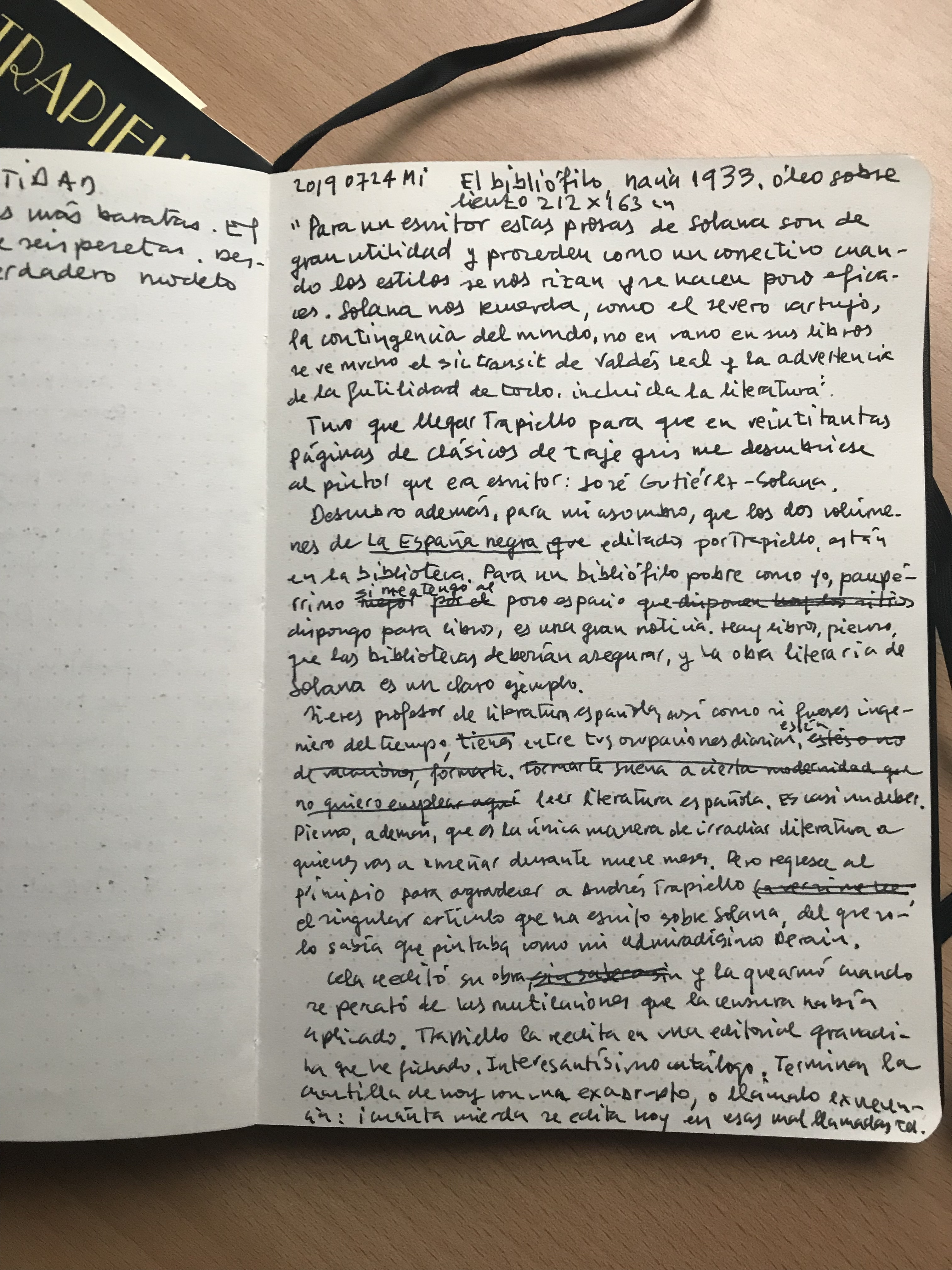 De las obras que cita Trapiello en el extenso artículo contenido en este libro, los dos volúmenes de La España negra, editados por el mismo Trapiello, están en la biblioteca. Para un bibliófilo pobre como yo, paupérrimo si me atengo al poco espacio para libros que tengo en casa, esto es una gran noticia. Hay libros, lo pensaba esta mañana, que las bibliotecas debieran asegurar. Estos de Solana son un ejemplo.