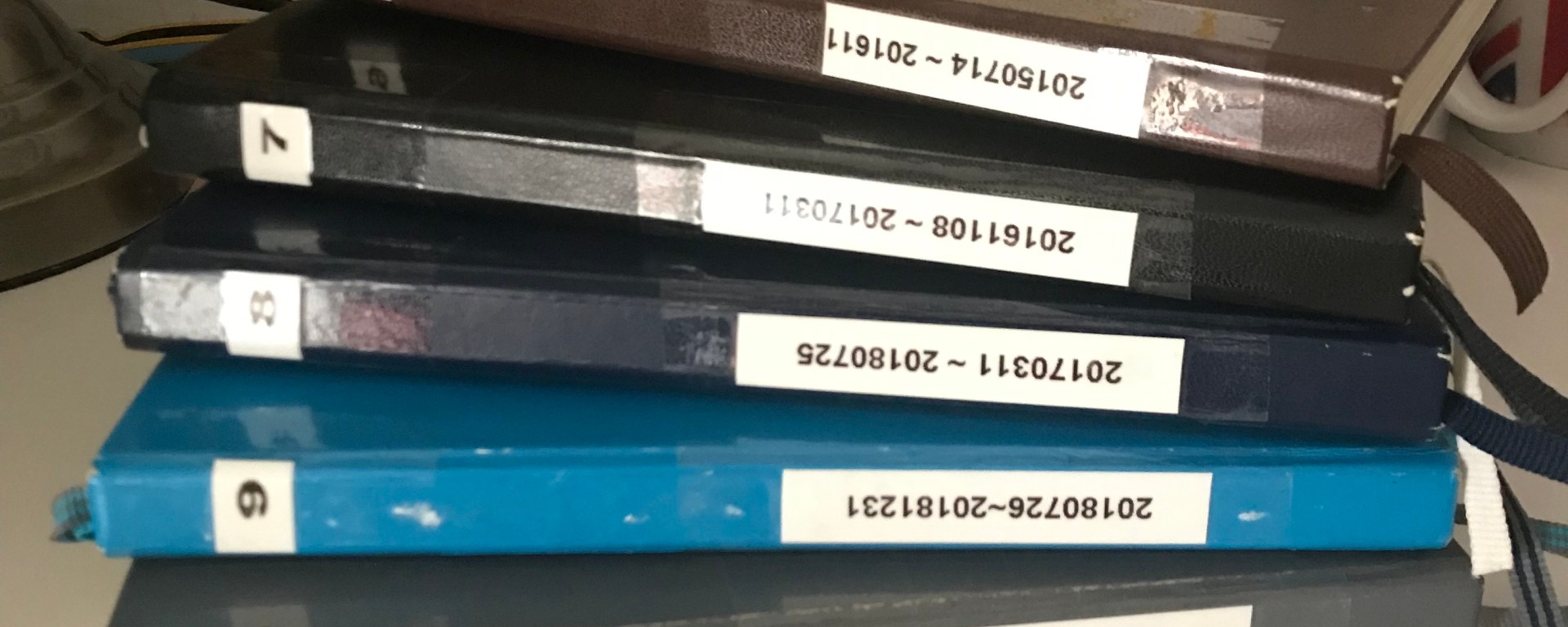 Vas certificando que vives con cada cuaderno que acabas. Hoy no solo acaba julio de 2019, sino que terminas el cuaderno 20190501; o el “Peiper”, como nombré a este. 20190501, donde 2019 es el año, 05 es el mes en que lo empecé y 01 el día. Después le coloco una etiqueta en el lomo y el número de orden que le corresponde; y lo archivo no sin antes escanear el índice. Desde que descubrí el método Bullet Journal todos mis cuadernos tienen un índice. Es una de las aportaciones más útiles del método. Desde que utilizo el método Bullet Journal para mi organización personal, algo ha mejorado. O mucho, no lo sé. Solo puedo compararlo con lo mucho que trajinaba antes. Y el trajín, antes, era muy digital. Hoy sería incapaz de organizarme con una aplicación. La única que utilizo, y que replica las citas que llevo en el cuaderno es Google Calendar. Todo lo demás, y todo lo demás son notas, tareas, citas, ideas, apuntes, recuerdos, diario, registros, borradores, tropos, oraciones, vida interior, vida exterior, libros, desideratas, dibujos, gastos y colores se reúnen en el cuaderno. Y así es como se va certificando tu vida. Tiene algo aurático este registro escrito; es, dice Chejfec en Últimas noticias de la escritura, como si la escritura material permaneciera como lo inscrito en la realidad, como si ese manuscrito físico, en este caso ese conjunto de notas variopintas, fuese garantía de verdad, o de vida verdadera o de la autorreflexividad.