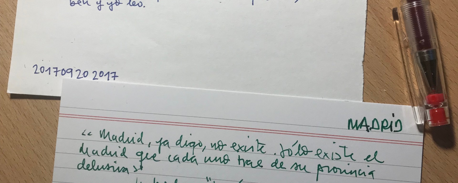 Es de Umbral y está escrita en “Azorín, a pan y agua”. Añado en la ficha “En los alucinados. p38”. Después sigo escribiendo “Cambiando Madrid por J para próximo artículo”. Lo que más me molesta ahora es no haber escrito la fecha en que tomé la cita. No suelo olvidar escribirla, pero esta vez es comprobable que olvidé apuntarla. Hubiese sido algo parecido a 201908191901, donde 2019 es el año, 08 agosto y 19 el día. A las 19:01.