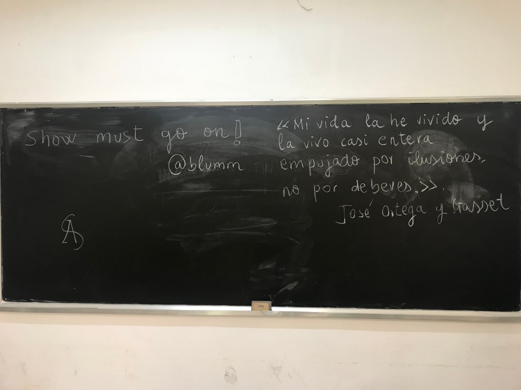 Mientras los alumnos completan sus exámenes, él lee. Y subraya fragmentos como “siempre me ha repugnado el frecuente personaje a quien oímos decir constantemente que se cree en el deber de esto o de lo otro. Yo me he creído muy pocas veces en deberes durante mi vida. La he vivido y la vivo casi entera empujado por ilusiones, no por deberes”. La frase le parece buena, incluso muy buena, para despedirse del aula donde está y ha estado en este curso. La va a plasmar sobre la pizarra antes de salir del aula por última vez. Espera a que todos los alumnos terminen sus exámenes, se levanta y escribe: “Mi vida la he vivido y la vivo casi entera empujado por ilusiones, no por deberes”. Le ha echado una foto y ha cerrado el aula. Baja las escaleras que dan acceso a la sala de profesores pensando en la cita, con ilusión.