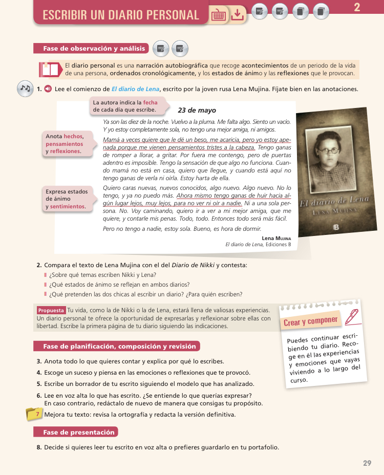 Hoy he explicado en 1º de ESO qué es un diario. Suelo ser muy escrupuloso en la programación que hago de aula, que confecciono domingo tras domingo por la tarde, y hoy tenía previsto seguir lo que el libro de texto me proponía. Así que, claro, ahí estaba a primera hora de la mañana enseñando la portada del libro de Trapiello a gentecillas que no alcanzan los catorce años. Les he leído un fragmento, y después otro, y después ya, me he puesto con lo que me ofrecía el libro de texto, y con ese texto de El diario de Lena, que era esto que les quería enseñar. No me he leído El diario de Lena.