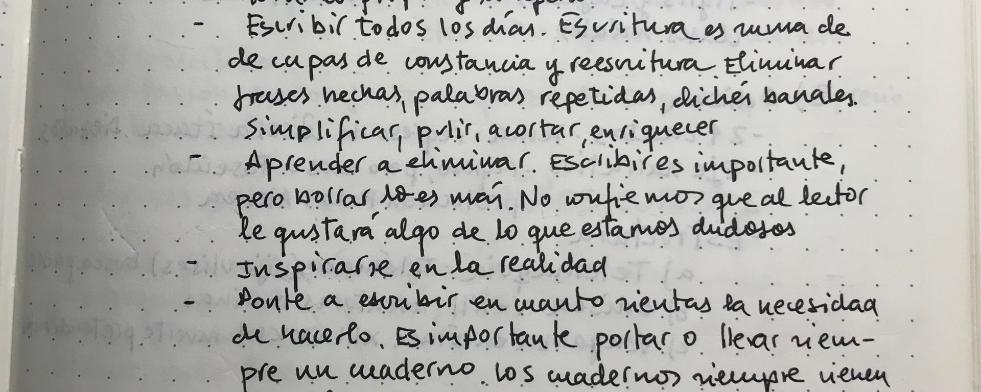 Portar siempre un cuaderno. Siempre surgen ideas cuando lees: buenas frases, metáforas atípicas. Hay que tener cuadernos y libretas literarias. Anotar lo propio y lo ajeno.