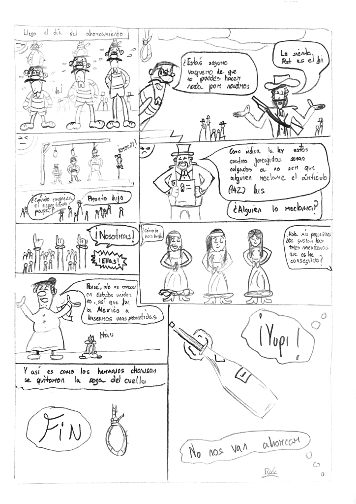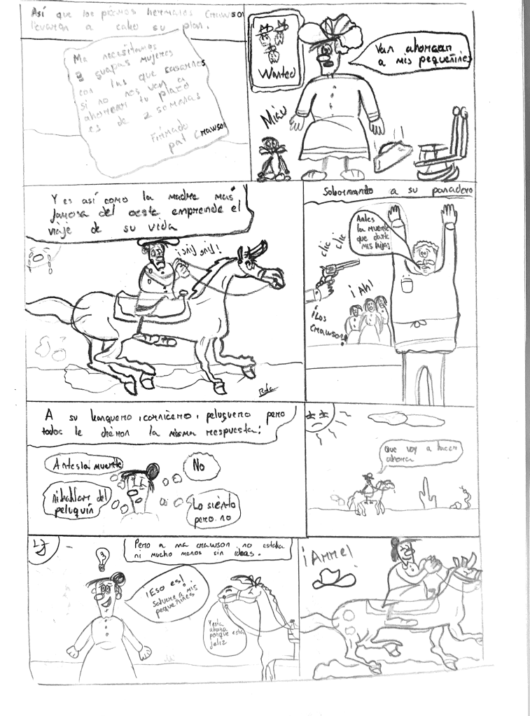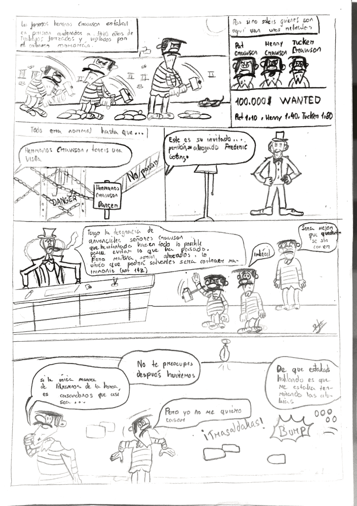 El cómic que presentó como tarea lo vio el martes Peternews, que es el amigo de su padre, el amigo que trabaja en una librería. Le sugirió que lo tintase. Y que por favor, le hiciese una copia, es decir, que le regalase una fotocopia. Parece que le gustó, y le gustó mucho. Mira y lee el cómic de R, bueno, y lee sus viñetas y sus bocadillos. Nada hay calcado, todo está, como debe ser, dibujado a sangre. Bueno, a sangre no: