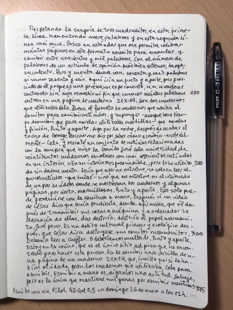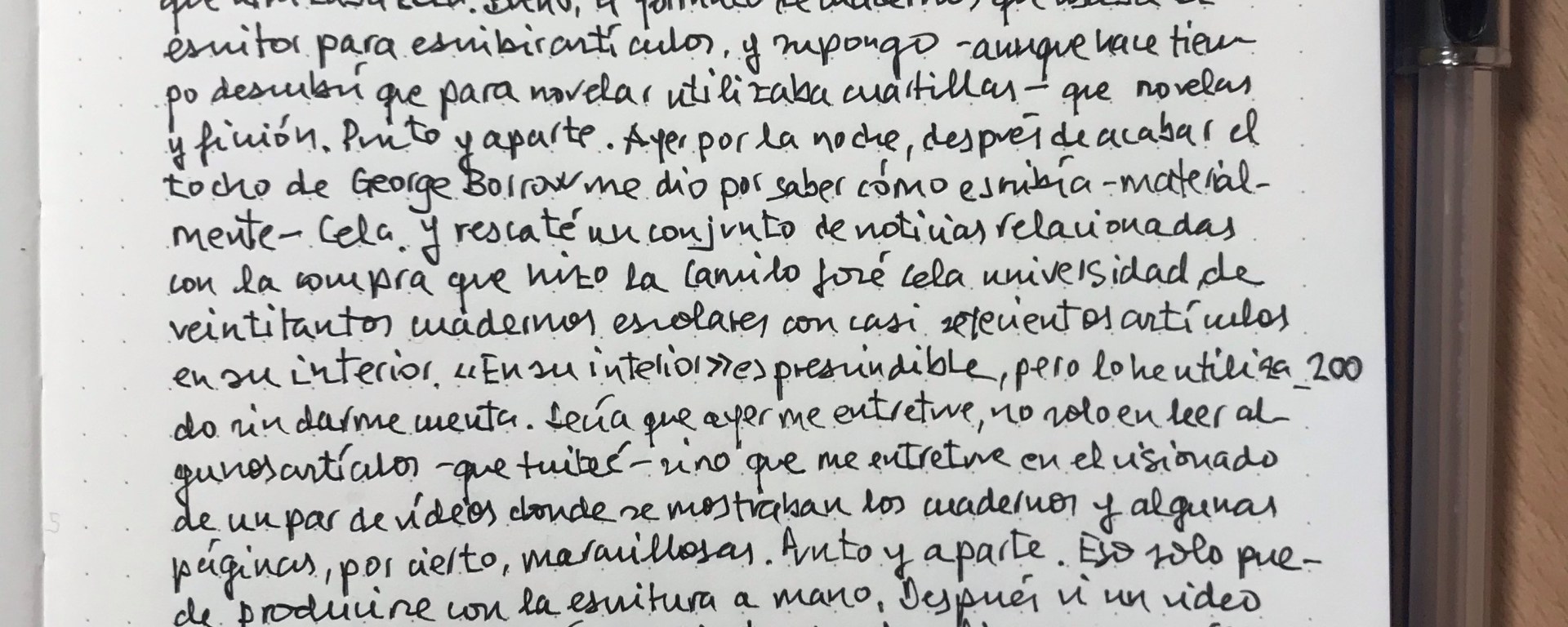 Respetando la sangría de tres cuadraditos, en esta primera línea han entrado nueve palabras y en esta segunda línea casi once. Busco un estándar que me permita calibrar cuántas páginas en este formato necesito para acumular y escribir entre novecientas y mil palabras. Son el número de palabras de un artículo de opinión más bien extenso, largo, suculento. Paro y cuento. Ahora van sesenta y seis. Aquí iría un punto y aparte, pero prescindo de él porque es una prueba, un experimento, un acontecer contando sin más remedio ni fin que conocer cuántas palabras entran en una página de cuaderno 21 x 14. Son los cuadernos que utilizaba Cela. Bueno, el formato de cuadernos que usaba el escritor para escribir artículos, y supongo -aunque hace tiempo descubrí que para novelar utilizaba cuartillas- que novelas y ficción. Punto y aparte. Ayer por la noche, después de acabar el tocho de George Borrow, me dio por saber cómo escribía -materialmente- Cela. Y rescaté un conjunto de noticias relacionadas con la compra que hizo la Camilo José Cela universidad, de veintitantos cuadernos escolares con casi setecientos artículos en su interior. «En su interior» es prescindible, pero lo he utilizado sin darme cuenta. Decía que ayer me entretuve, no solo en leer algunos artículos -que tuiteé-, sino que me entretuve en el visionado de un par de vídeos donde se mostraban los cuadernos y algunas páginas, por cierto, maravillosas. Punto y aparte. Eso solo puede producirse con la escritura a mano. Después vi un vídeo de César Aira que tenía pendiente, donde afirmaba que él después de transcribir sus cosas a máquina y a ordenador se deshacía de ellas, las destruía: destruía el papel manuscrito. Qué pena. Es un delito cultural primero y ecológico después, que César Aira destruyese sus escritos manuscritos. Debería leer a Chejfec. O deberíamos multarle. Punto y aparte. Estoy en la cocina, que es el único sitio del piso que he encontrado para hacer esta prueba, la de escribir una carilla de una página de un cuaderno 21 x 14, que, insisto por si lo habías olvidado, eran los cuadernos que utilizaba Cela para escribir. Escribir a mano es, digamos, una actitud salvaje, pero es la única que mantiene mis ganas por escribir mentiras. (375 palabras)