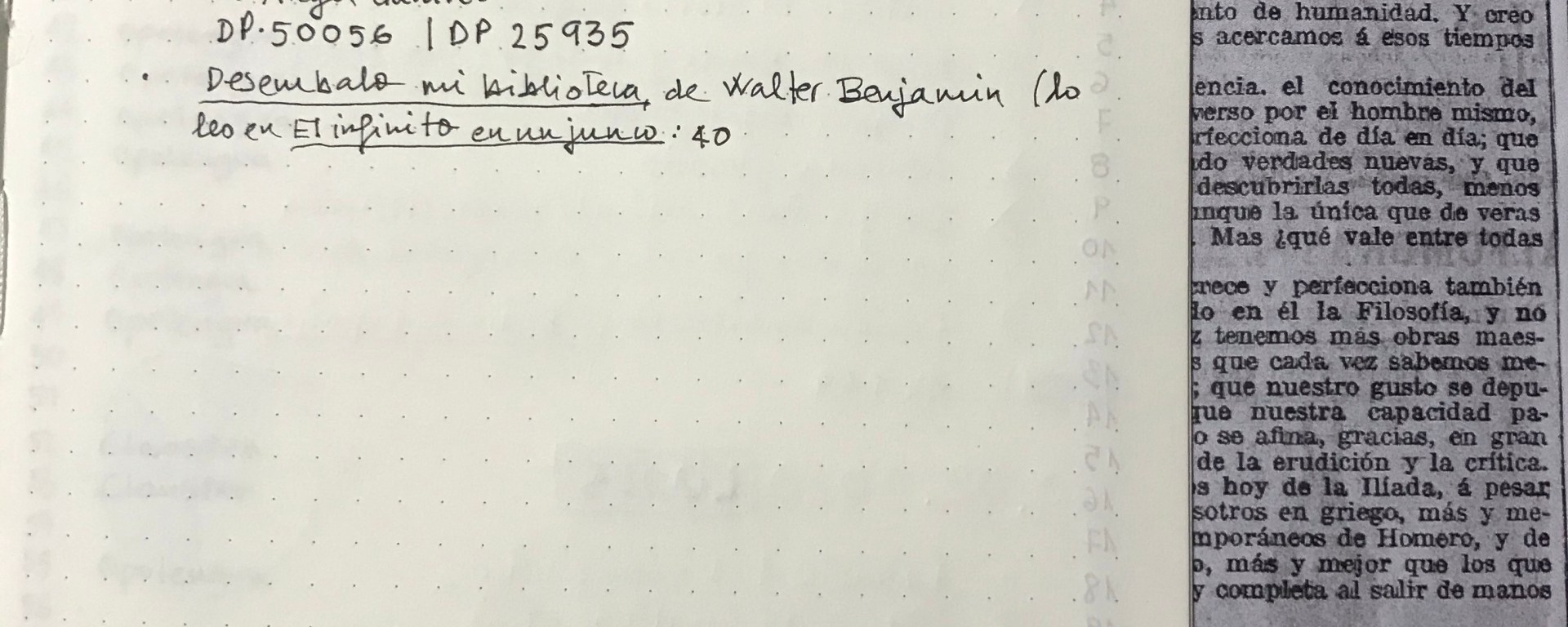 Ha sido el primer libro que he apuntado en la colección «Libros/Desideratas de febrero de 2020» de mi cuaderno, o bulletjournal si me lees desde U.K. o EE.UU. El segundo ha sido Desembalo mi biblioteca, de Walter Benjamin. No he leído nada de Benjamin, pero El infinito en un junco lo refiere de mágico modo.