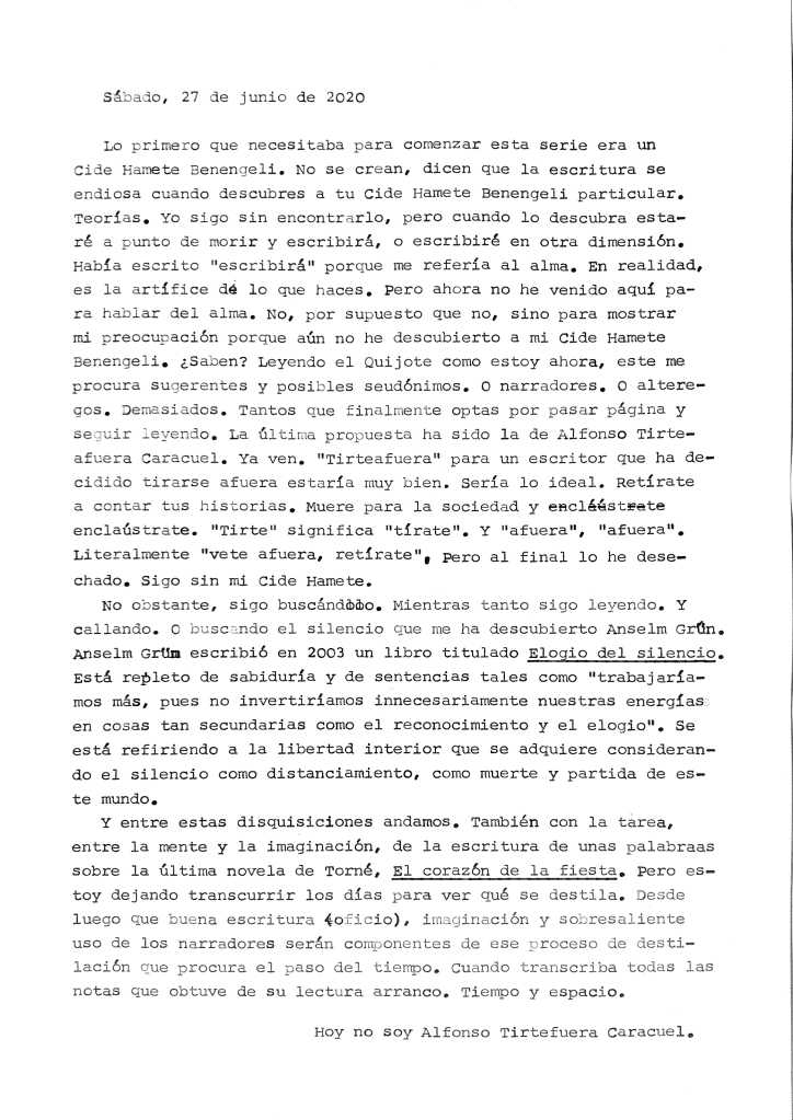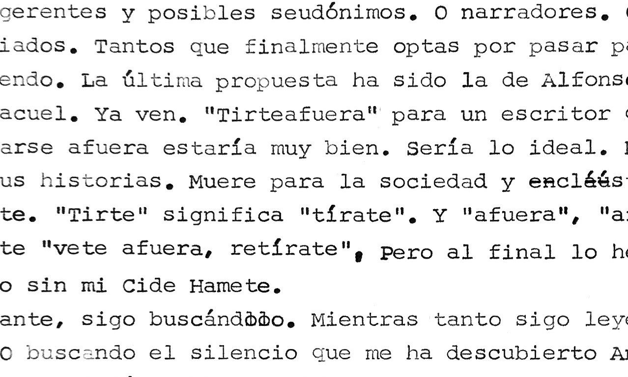Había escrito «escribirá porque me refería al alma. En realidad, es la artífice de lo que haces. Pero ahora no he venido aquí para hablar del alma. No, por supuesto que no, sino para demostrar mi preocupación porque aún no he descubierto a mi Cide Hamete Benengeli. ¿Saben? Leyendo el Quijote como estoy ahora, este me está procurando sugerentes y posibles seudónimos. O narradores. O alteregos. Demasiados. Tantos que finalmente optas por pasar página y seguir leyendo. La última propuesta ha sido la de Alfonso Tirteafuera Caracuel. Ya ven. «Tirteafuera» para un escritor que ha decidido tirarse afuera estaría muy bien. Sería lo ideal. Retírate a contar tus historias. Muere para la sociedad y enclaústrate. «Tirte» significa «tírate». Y «afuera», «afuera». Literalmente, «vete afuera, retírate». Pero al final lo he desechado. Sigo sin mi Cide Hamete.