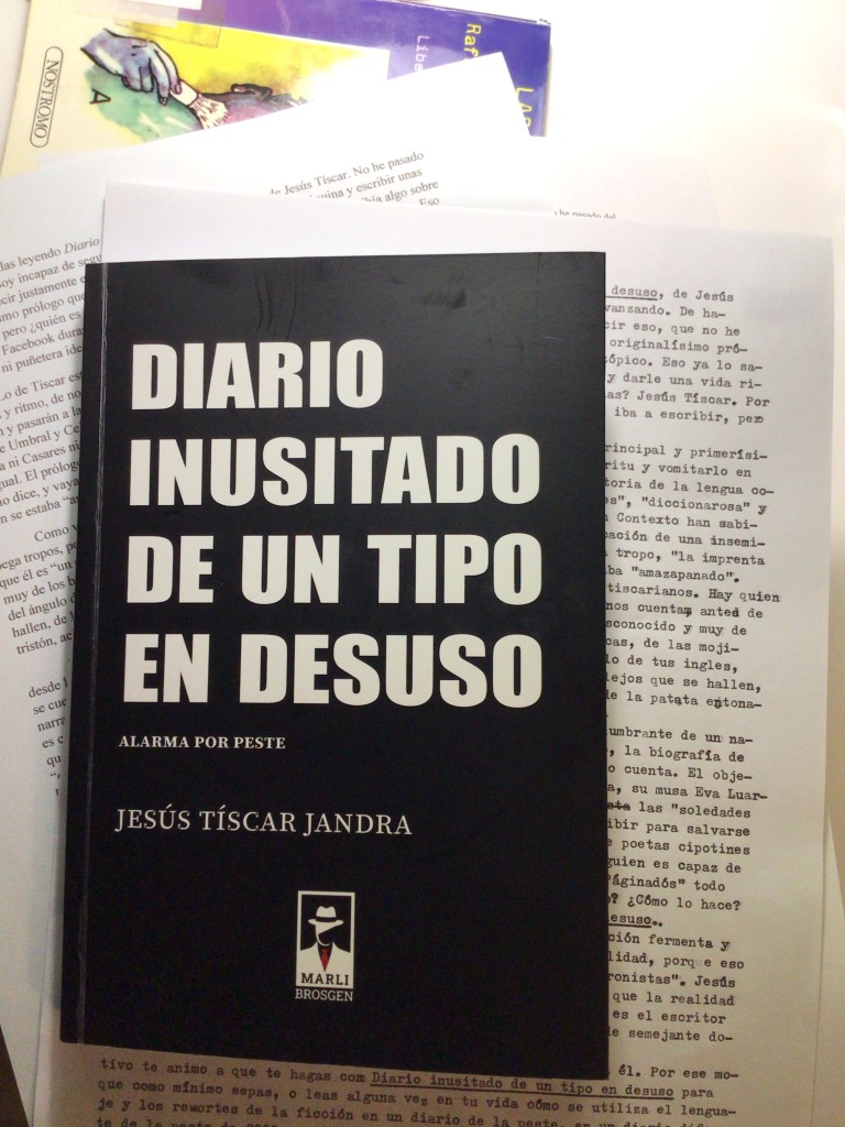 Me pillas leyendo Diario inusitado de un tipo en desuso, de Jesús Tíscar. No he pasado del prólogo. Soy incapaz de seguir avanzando sin sacar la máquina y escribir unas letras para decir justamente eso, que no he sido capaz de seguir leyendo si no escribía algo sobre el originalísimo prólogo que inventa. Escribir originalísimo prólogo es muy tópico. Eso ya lo sabía, pero ¿quién es capaz de crearse un “alter ego rancio y darle una vida ridícula para airearla en Facebook durante sesenta y ocho días”? Jesús Tíscar Jandra. Por lo menos es sincero: “sin tener ni puñetera idea de lo que iba a escribir, pero sí a quien se lo iba a escribir”.