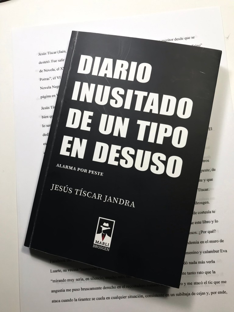 Diario inusitado de un tipo en desuso está publicado por una editorial jovencísima: Marli Brosgen. Sevillana, y no sé si de Triana. Tiene todos los derechos reservados, pero en las páginas de cortesía te advierten, acariciándote la mejilla: “si decides compartir cualquiera de los contenidos de este libro y lo haces por ‘amor al arte’, hazlo con total libertad, mientras cites la fuente”. Qué generosos. ¿Por qué? Quizá porque el diario fue escrito durante los sesenta y ocho primeros días de la pandemia en el muro de Facebook del autor. Allí dio vida a su Jesús Tíscar super alter ego, al personaje femenino y calambur Eva Luarte, su vecina “camarada de tetas”, con la que se quería casar y que se le quedó nada más verla “mirando muy seria, en silencio, mucho rato, tan seria y tan en silencio y durante tanto rato que la angustia me puso bruscamente derecho en el recostadero romano del tío Pilaro y me atacó el tic que me ataca cuando la tirantez se cuela en cualquier situación, consistente en un subibaja de cejas y, por ende, de gafas”. Su queridísima vecina, pues. Aparece entre las páginas el Pidarra, que no es más correveidile, mendigo y pordiosero porque no entrena. Le falta ser puto. Y no sé si al final, en la imaginación del autor, acabaría así, puto y celestino. Léete el libro y lo descubres. Por último, aparece el Bobas, que es en realidad, un follamigo de esos bipolar; bipolar, seguro. Todo follamigo es bipolar, en la realidad y en la ficción. Algún día me entretendré en demostrar esta hipótesis.