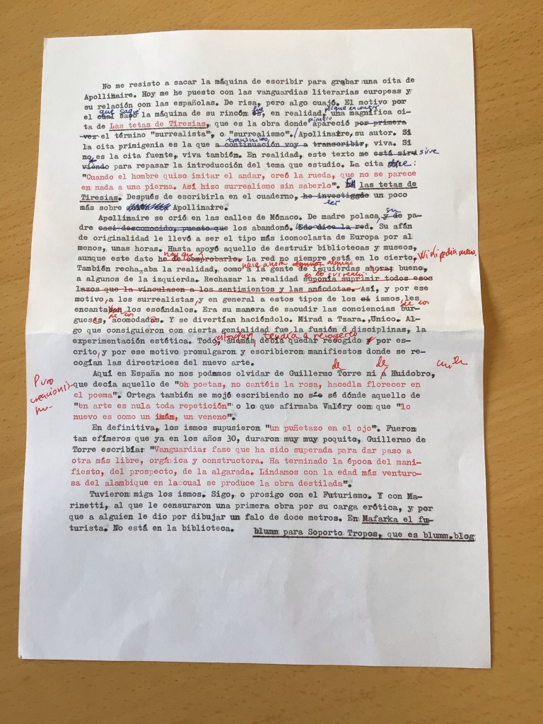 No me resisto a sacar la máquina de escribir para grabar una cita de Apollinaire. Hoy me he puesto con las vanguardias literarias europeas y su relación con las españolas. De risa, pero algo cuajó. El motivo por el que saqué la Olivetti de su rincón fue, en realidad, porque encontré una magnífica cita en Las tetas de Tiresias, que es la obra donde por primera vez apareció el término surrealista, o surrealismo. Apollinaire, su autor. Si la cita primigenia es la que transcribo, viva. Si no es la cita fuente, viva también. En realidad, este texto me sirve para repasar la introducción del tema que estudio. La cita, que es muy buena, dice: