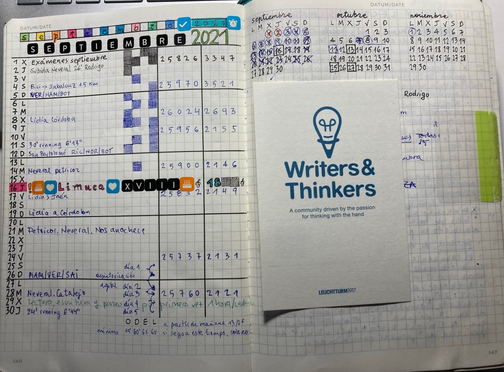 Este registro mensual se convierte, en realidad, en una línea temporal que mi yo futuro me agradecerá cuando regreso a él. Me aporta claridad y contexto, como dice Ryder Carroll en El método Bullet Journal. También te aconseja que lo que escribes en el calendario sea corto. Bueno, de hecho, no hay mucho espacio.
