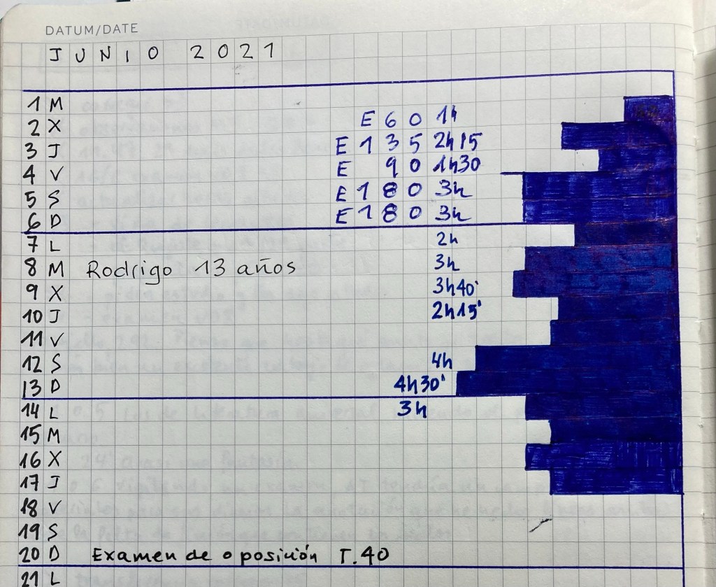Si ves el calendario de la tercera imagen, que era junio de 2021, comprobarás en qué estaba enfocado: en la oposición que me llevé ese mismo mes en el IES Auringis. Resaltan las horas de estudio que conseguía sacar durante el día antes del día del primer examen de la oposición. Bullet Journal, tampoco sería exagerado afirmarlo, me ayudó a ganar unas oposiciones (podría ser otra serie, por cierto)