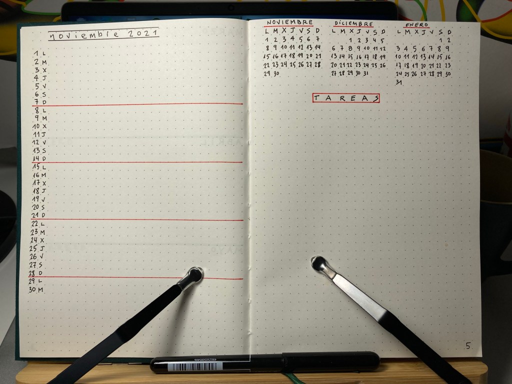 ¿Cómo tienes que diseñarlo en tu cuaderno? Tienes que situar en dos páginas enfrentadas el calendario del mes, en la parte izquierda, tal y como te muestro, y una página de tareas en la derecha. Personalmente me gusta tener tres meses a la vista, el que está en curso y dos más. Sobre todo, para tener un calendario a corto plazo siempre a mano. No olvides, una vez dibujado, escribir en el índice «Página 4-5 noviembre 2021»