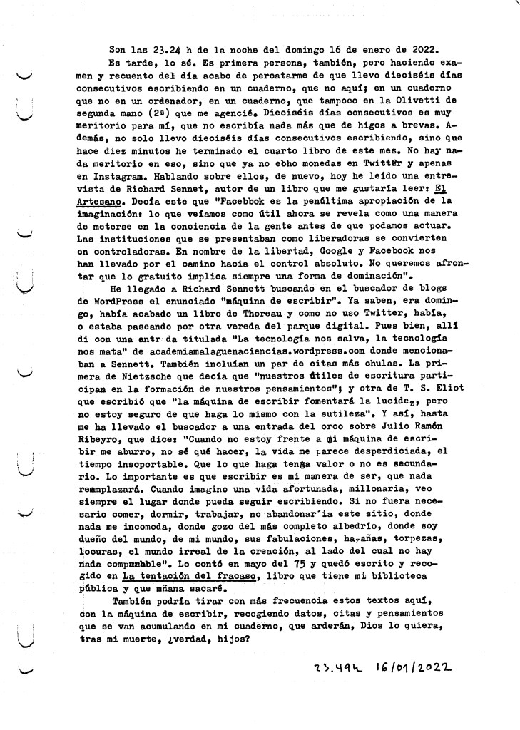 Es tarde, lo sé. Es primera persona, también, pero haciendo examen y recuento del día acabo de percatarme de que llevo dieciséis días consecutivos escribiendo en un cuaderno, que no aquí; en un cuaderno que no en un ordenador, en un cuaderno, que tampoco en la Olivetti de segunda mano que me agencié hace algunos años. Y lo hago durante casi veinte minutos sin descanso. Dieciséis días consecutivos es algo muy meritorio para mí, porque no escribía nada más que de higos a brevas. Además, no solo llevo dieciséis días consecutivos escribiendo, sino que hace diez minutos he terminado el cuarto libro de este mes. No hay nada meritorio en eso, sino en que ya no le echo monedas a Twitter y apenas en Instagram. Hablando sobre ellos, de nuevo, hoy he leído una entrevista de Richard Sennet, que es el autor de un libro que me gustaría leer: El artesano. Decía Sennet que:
