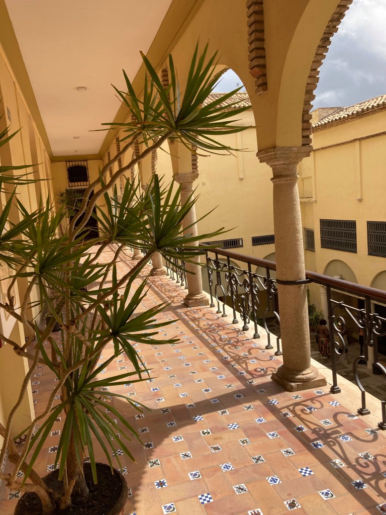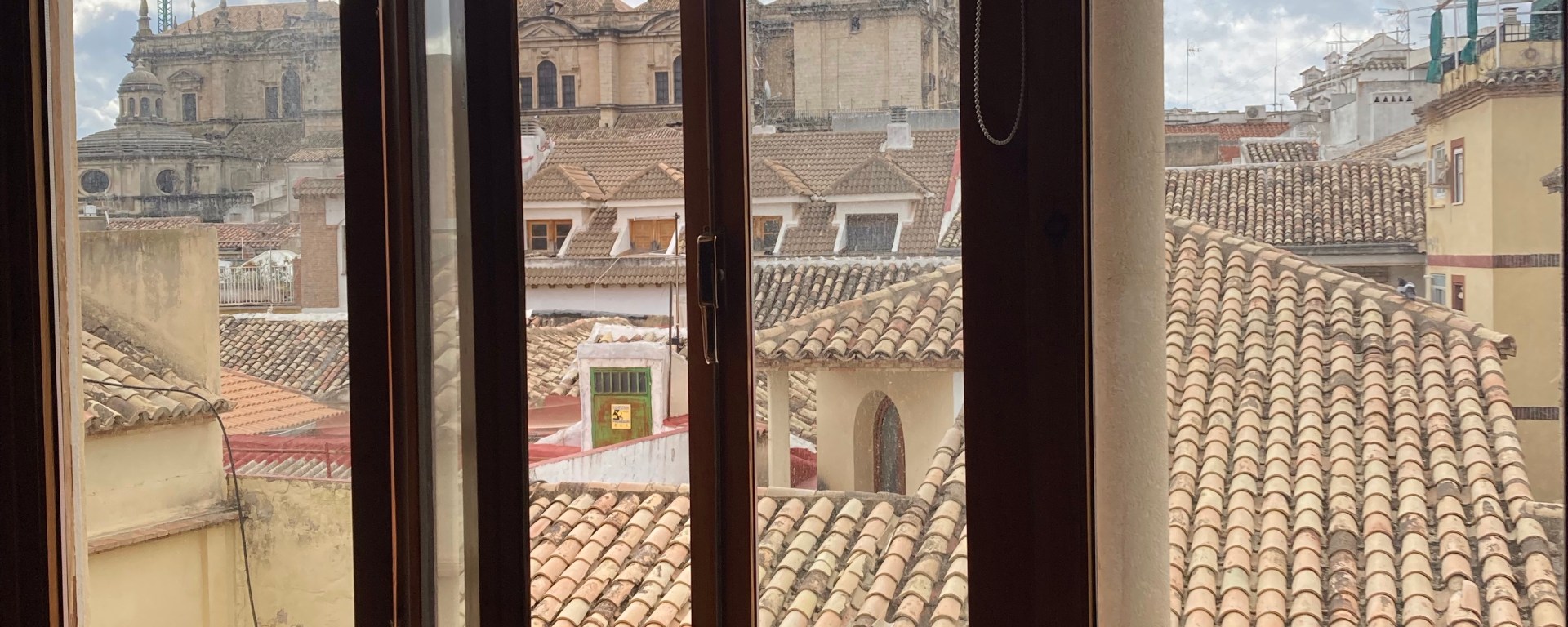 La cuartilla que no es cuartilla es ahora carilla que se acaba. Escribo viendo desde su lateral, la fachada principal de la Catedral de Jaén. Sin duda, esta biblioteca es un locus amoenus de mi imaginario, y del imaginario de Langlois, que está de vacaciones. Esta biblioteca, situada en pleno centro del casco histórico de Jaén, está enclavada en el Palacio del Condestable Iranzo, que fue residencia del que fue asesinado en la catedral que diviso ahora desde la que fue también su residencia, la de Miguel Lucas de Iranzo, condestable de la ciudad de Jaén a finales del siglo XV. Debió rezar poco porque lo asesinaron de una forma muy cruel, como cuentan las crónicas: