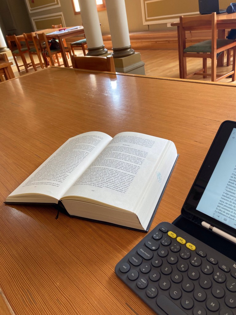 Como me propongo escribir todos los días durante un año, o durante la inercia que me proporcione la vida de los días, una carilla de Word a Times New Roman de 12 puntos —aunque no sé si publicaré aquí todos los días el resultado—, me he venido a la biblioteca con Cuadernos de todo, libro para esta Semana Santa, y glosar sin remilgos uno de sus fragmentos, tomarlo como pretexto para este otro. Mientras escribo, el libro permanece abierto a mi izquierda por la página 159, que es la página donde ayer leí que Carmen Martín Gaite, muchas mañanas, solía sentarse en el pupitre 22 de la biblioteca del Ateneo de Madrid. Así: “Suelo ponerme aquí, en el pupitre 22”.