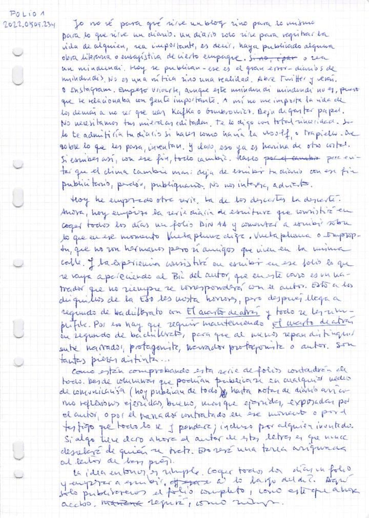 Hoy he empezado otra serie. Esta. La de los descartes la descarté. Ahora empiezo la serie del folio diario, que consistirá en coger todos los días un folio DIN A4 y comenzar a escribir donde pueda y sobre lo que se le ocurra a Vuelapluma. Vuelapluma o Impromptu, que hay que nombrarlos a todos. No son hermanos, sino amigos. Viven en la misma calle. Esta serie consistirá en escribir todos los días una carilla de folio y transcribirlo aquí cuando se pueda. Algunas veces lo haré de manera manuscrita y otras, mecanoscrita. Me encanta escribir con máquina de escribir. De vez en cuando subiré una foto, para que te lo creas, para que veas cómo pervierto la ficción, y que la palpes. Quiero decir que desconozco a quién ha contratado el autor para que escriba el diario. El autor, el narrador, el narrador protagonista o testigo, el interlocutor y la madre que los parió. Qué bien ilustra El cuarto de atrás estos vericuetos de la ficción. Por eso, piensa Vuelapluma, hay que mantenerlo como lectura obligatoria en segundo de bachillerato. Sin compasión. ¡Todos a la Isla de Bergai!