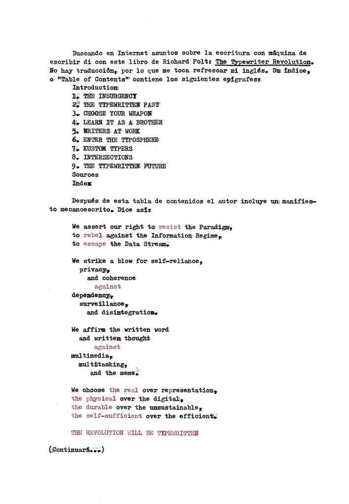 Buscando en Internet asuntos sobre la escritura con máquina de escribir, di con este libro de Richard Polt: The Typewriter Revolution. No hay traducción, por lo que me toca refrescar el inglés. Su índice, o «Table of Contents» contiene los siguientes epígrafes: