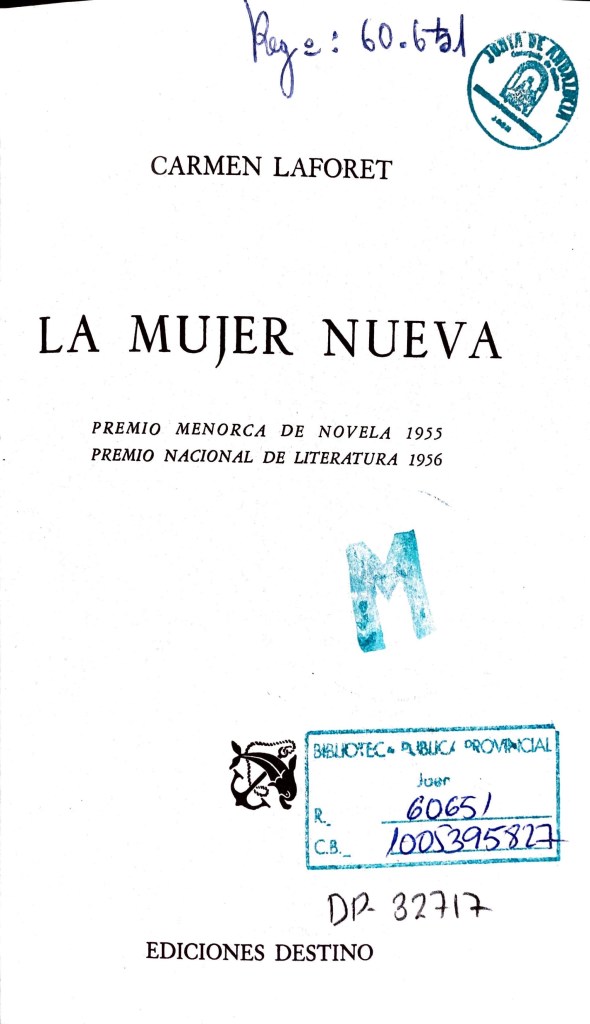 LAFORET, Carmen (1975). La mujer nueva. Barcelona: Destino. 291 páginas.