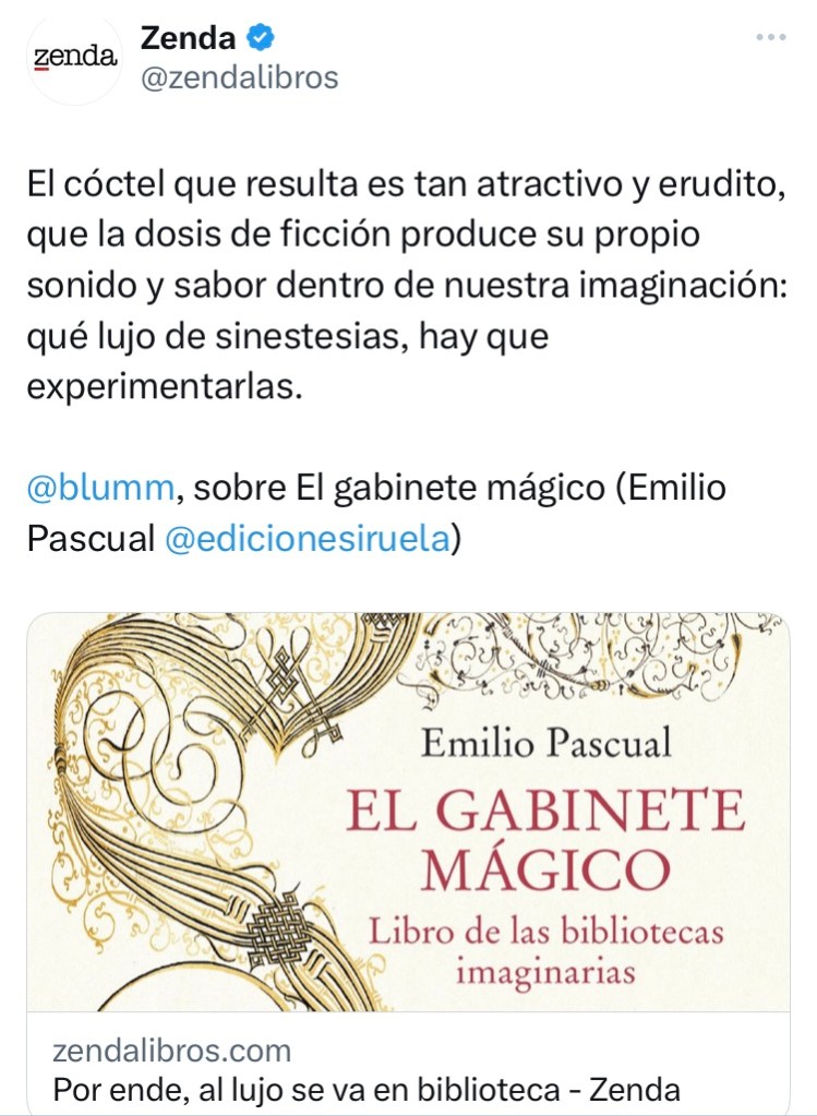 Les pongo un ejemplo. En El gabinete se reúnen casi ochenta bibliotecas. Pues bien, entre ellas está “La biblioteca de Bastián”, entre corchetes [MICHAEL ENDE: La historia interminable]. De esta manera se presentan las bibliotecas. En las páginas siguientes, tras el autor y la obra donde aparecen, se van glosando no solo los libros que arman los plúteos de dichas bibliotecas, sino los detalles y las anécdotas, las citas y las notas a pie de página que se destilan, en este caso, en La historia interminable: “Las pasiones humanas son un misterio. La de Bastián era leer, y esa lo llevó a otra no menos misteriosa: la de imaginar”. Se mezclan, por tanto, como si de una copa Margarita se tratara, la experiencia lectora del personaje, la experiencia lectora del creador de ese personaje y la experiencia lectora del autor de El gabinete mágico, en este caso, la experiencia como lector deEmilio Pascual. El cóctel que resulta es tan atractivo y erudito, que la dosis de ficción produce su propio sonido y sabor dentro de nuestra imaginación: qué lujo de sinestesias; hay que experimentarlas. En la biblioteca de Bastián se nombran no solo libros, sino referencias ajenas que vienen al caso del protagonista, Bastián, enseñándonos lo que se mueve dentro de esa historia y vinculándonos a otras historias. Resulta un relato alimentado no solo por el personaje, sino por los libros que alimentan la historia, dotando de entidad y verosimilitud el viaje del lector. ¡Vaya juguete de ficción! Un cóctel que hay que beber despacio.