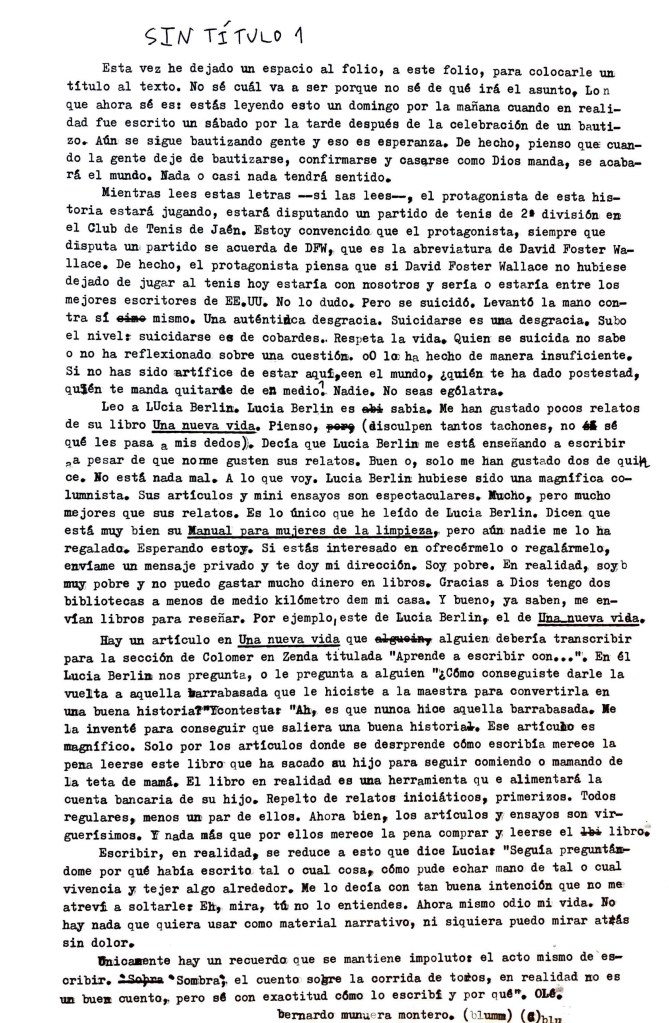 Mientras lees estas letras -si las lees-, el protagonista de esta historia estará jugando, estará disputando un partido de tenis de 2ª división en el Club de Tenis de Jaén. Estoy convencido de que el protagonista, siempre que disputa un partido se acuerda de DFW, que es la abreviatura de David Foster Wallace. De hecho, el protagonista piensa que si David Foster Wallace no hubiese dejado de jugar al tenis hoy estaría con nosotros y sería o estaría entre los mejores escritores de EE.UU. No lo dudo. Pero se suicidó. Levantó la mano contra sí mismo. Una auténtica desgracia. Suicidarse es una desgracia. Subo el nivel: suicidarse es de cobardes. Respeta la vida. Quien se suicida no sabe o no ha reflexionado sobre una cuestión. ¿? lo ha hecho de manera insuficiente. Si no has sido artífice de estar aquí, en el mundo, ¿quién te ha dado potestad, quién te manda quitarre de en medio? Nadie. No seas ególatra.