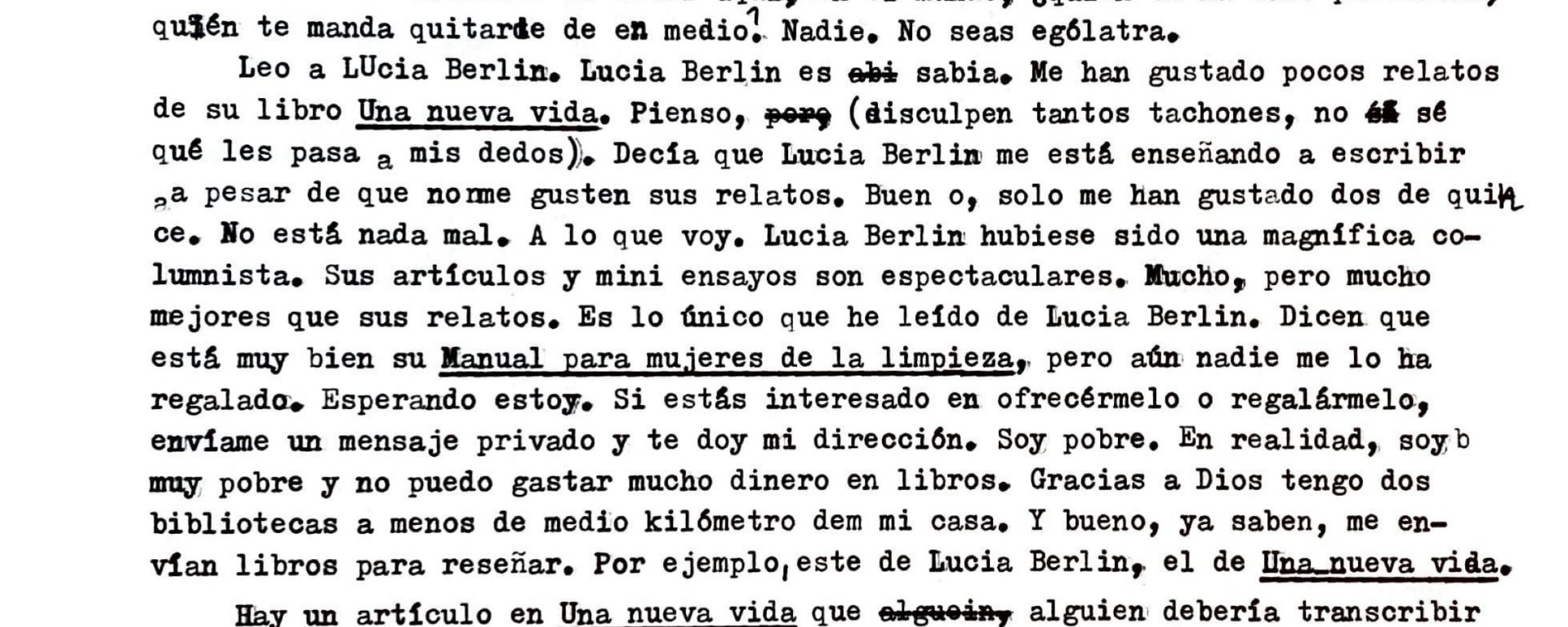 Leo a Lucia Berlin. Lucia Berlin es sabia. Me han gustado pocos relatos de su libro Una nueva vida. Pienso, (disculpen tantos tachones, no sé qué les pasa a mis dedos ). Decía que Lucia Berlin me está enseñando a escribir a pesar de que no me gusten sus relatos. Bueno, solo me han gustado dos de quince. No está nada mal. A lo que voy. Lucia Berlin hubiese sido una magnífica columnista. Sus artículos y mini ensayos son espectaculares. Mucho, pero mucho mejores que sus relatos. Es lo único que he leído de Lucia Berlin. Dicen que está muy bien su Manual para mujeres de la limpieza, pero aún nadie me lo ha regalado. Esperando estoy. Si estás interesado en ofrecérmelo o regalármelo, envíame un mensaje privado y te doy mi dirección. Soy pobre. En realidad, soy muy pobre y no puedo gastar mucho dinero en libros. Gracias a Dios tengo dos bibliotecas a menos de medio kilómetro de mi casa. Y bueno, ya saben, me envían libros para reseñar. Por ejemplo, este de Lucia Berlin, el de Una nueva vida.