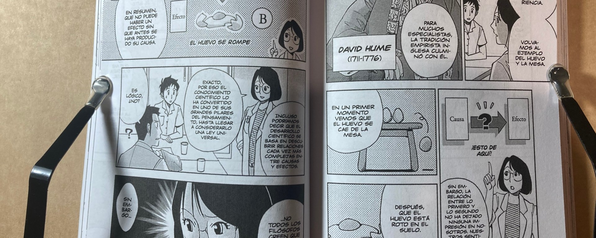 Pero estaba con Kant. ¿Qué puedo saber? ¿Qué debo hacer? ¿Qué me cabe esperar? Estas son algunas de las preguntas con las que Osaki, la profesora de filosofía del manga, introduce a sus alumnos en el pensamiento de este genio. La profesora es japonesa porque el título original, traído desde Japón, es Manga de dokuba, Critique of Pure Reason. Está traducido por Maite Madinabeitia, de DARUMA Serveis Lingüístics y desde mi punto de vista ha hecho un trabajo excelente. Tan excelente que he llegado a pensar que mi COU hubiese sido distinto si hubiese tenido una profesora que me hubiese explicado así no solo la Crítica de la razón pura, sino la Crítica de la razón práctica y la Crítica del juicio.