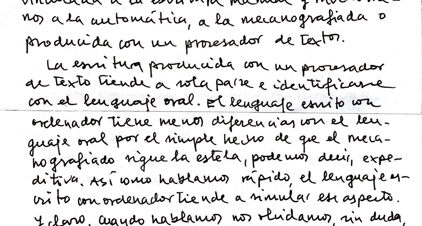 La escritura producida con un procesador de textos tiende a solaparse e identificarse con el lenguaje oral. El lenguaje escrito con ordenador tiene menos diferencias con el lenguaje oral por el simple hecho de que el mecanografiado sigue una estela, podemos decir, más expeditiva. Así como hablamos rápido, el lenguaje escrito con ordenador tiende a emular ese aspecto. Y claro, cuando hablamos nos olvidamos, sin duda, de buscar la voluntad de estilo que sí puede encontrarse en el ensimismamiento que procura la escritura a mano.