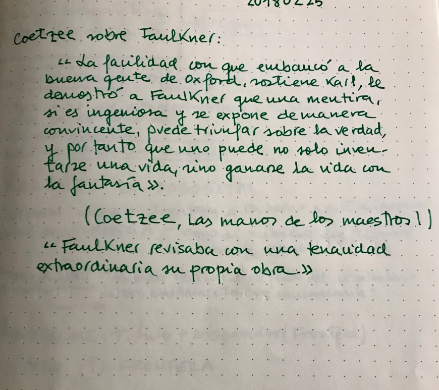 Coetzee sobre Faulkner: “La facilidad con que embaucó a la buena gente de Oxford, sostiene Karl, le demostró a Faulkner que una mentira, si es ingeniosa y se expone de manera convincente, puede triunfar sobre la verdad, y por tanto que uno puede no solo inventarse una vida, sino ganarse la vida con la fantasía”. Más adelante, tengo otra apuntada, también extraída de un libro … Continúa leyendo Tropo 177: Coetzee sobre Faulkner